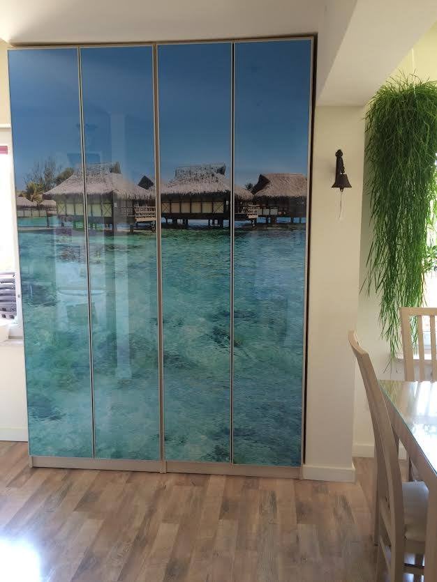 Wydruk , który po laminowaniu i naklejeniu na plexi został wykorzystany jako dekoracyjne wypełnienie zniszczonych drzwi szafy przesuwnej. Fotografia zyskała nowe funkcjonalne zastosowanie, stając się integralnym elementem wnętrza.